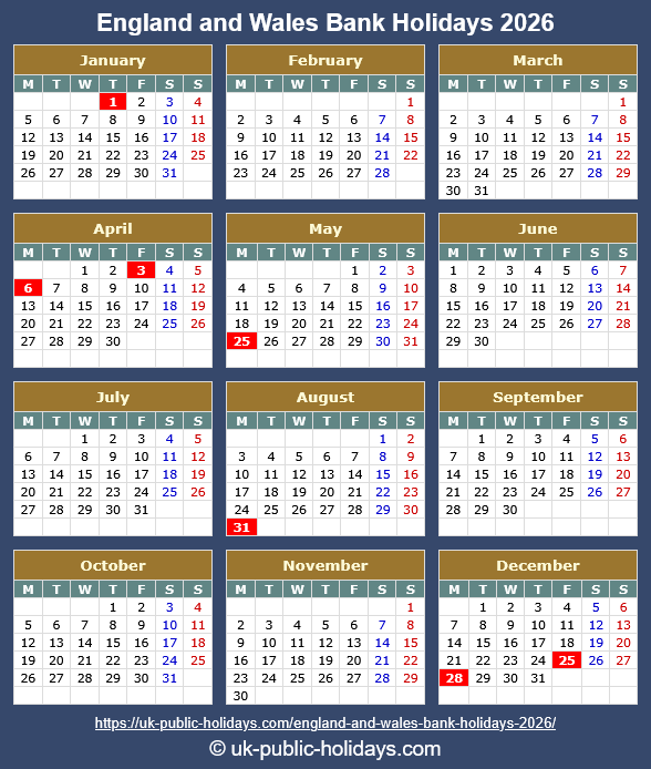 Check out the England and Wales bank holidays 2026. Find the 2026 holidays dates in England and Wales for New Year’s Day, Good Friday, Early May Bank Holiday, Spring Bank Holiday, Summer Bank Holiday, Christmas Day, Boxing Day etc.