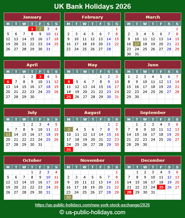 There are 9 bank holidays in England and Wales, 10 in Scotland and 11 in Northern Ireland. The UK Bank Holidays 2026 include St Patrick’s Day, Good Friday, Easter Monday, Early May bank holiday, Spring bank holiday, Orangemen’s Day, Summer bank holiday, St Andrew’s Day, Christmas and Boxing Day.